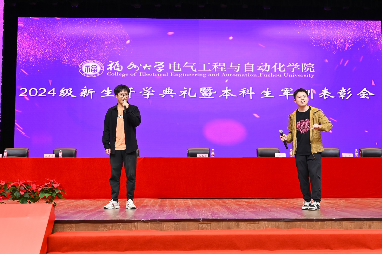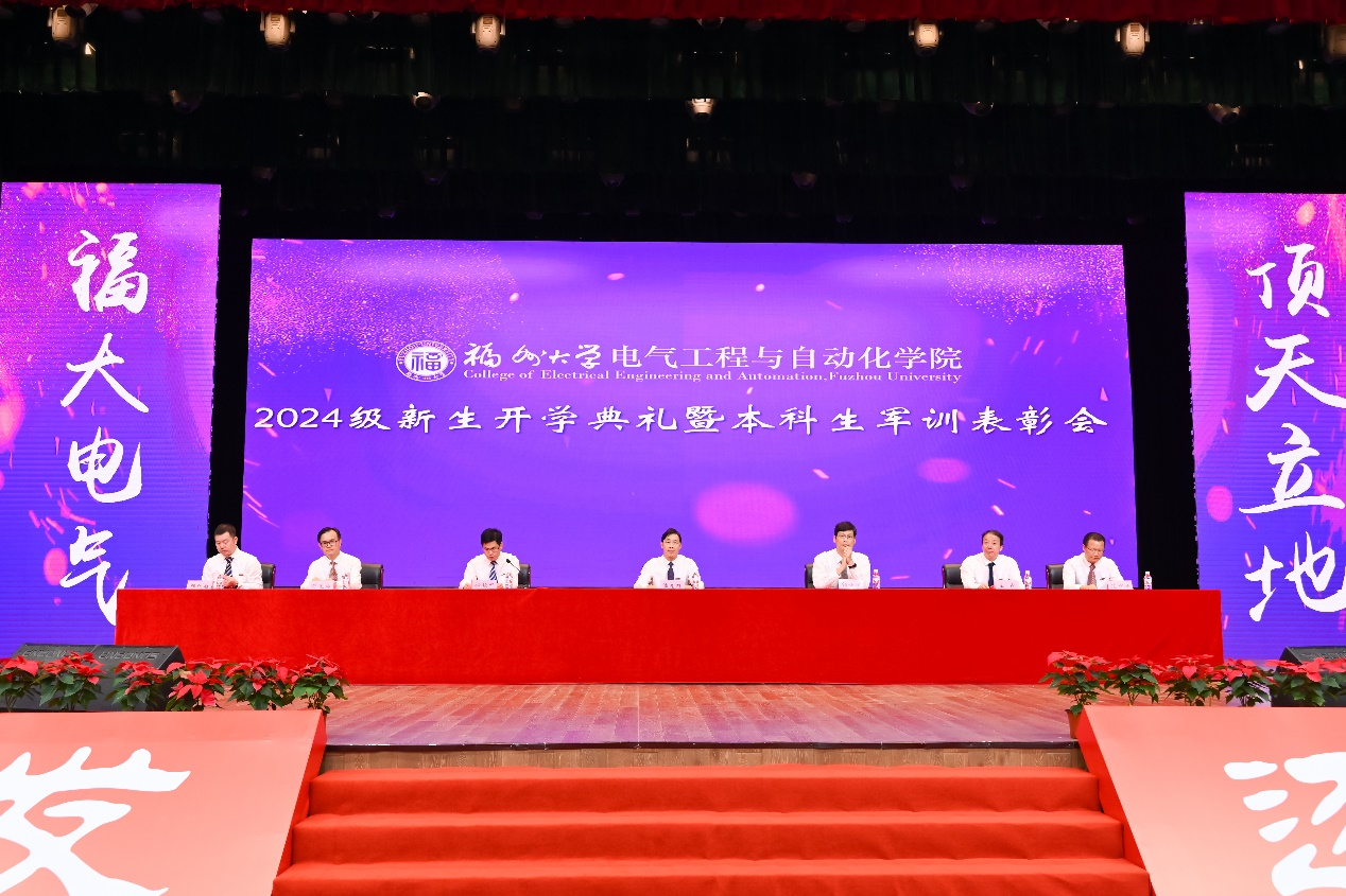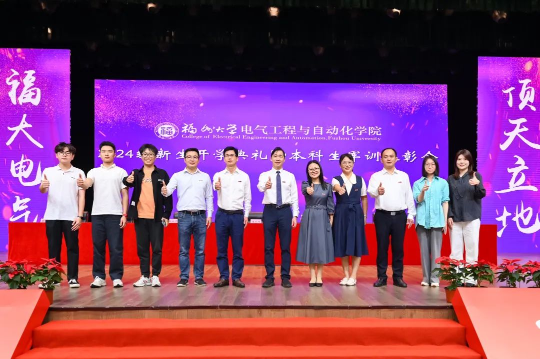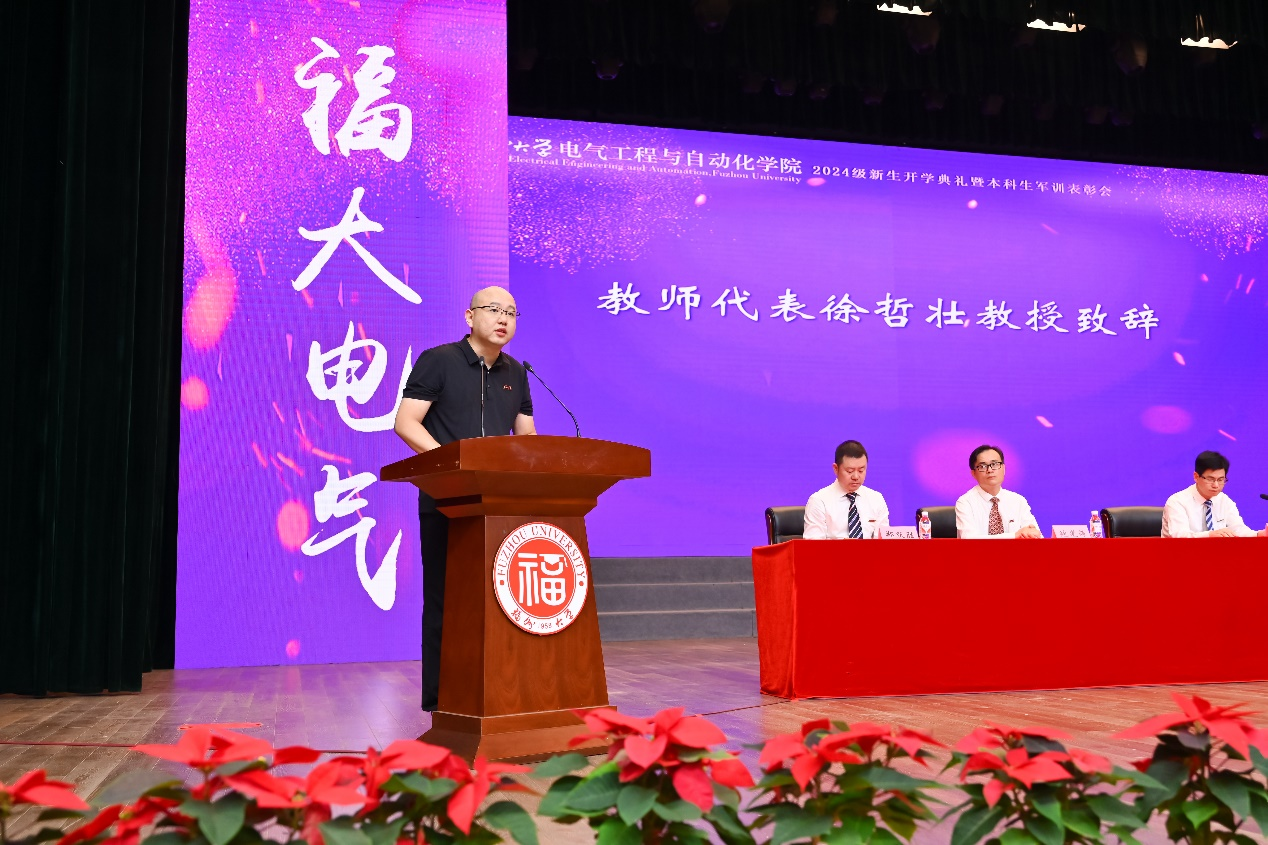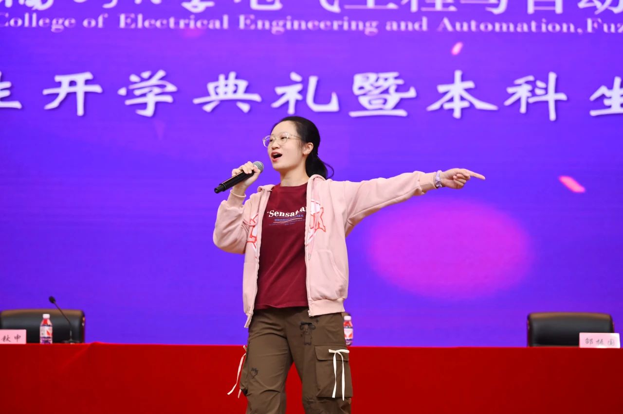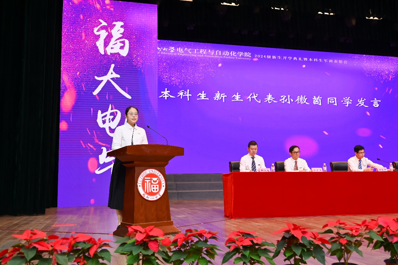 本科生新生代表孙微茵同学代表新生向师长和亲友表达感谢,并分享了自己坚毅扎实的成长历程。孙微茵提到,在福大她不仅感受到了学院的温暖,还通过担任年级长等职务获得了成长。她表示,作为新时代“电气人”,不仅要学习知识、增长本领,还要传承“福大电气,顶天立地”的精神,与时代同频共振,成为爱国奉献、追求卓越的新时代青年,共同为学院和学校争取荣誉,创造辉煌。