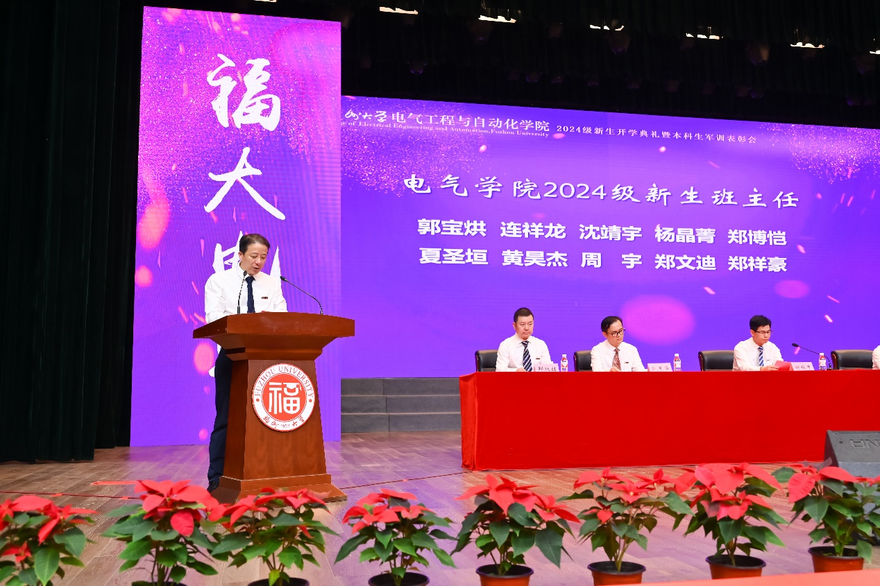 负责行政工作副院长邵振国教授代表学院对开启新征程的同学们表示欢迎,向辛勤培育他们的师长致以敬意。他介绍了学院的发展历程和成就,希望新“电气人”赓续接力,续写辉煌。邵院长提出三点期望:一是要立志勤学,做胸怀家国的电气人。志向决定人生的方向,视野决定人生的高度。在求学的道路上,新生们要不断探索、不断学习,要立大志、立长志,将个人的成长与国家的命运紧密相连;二是思学并进,做知行合一的电气人。要将学到的知识真真切切地落实到行动上,做到勤于学、敏于思、践于行。通过实践来检验和提升自己的知识水平和实践能力;三是学人之长,做行稳致远的电气人。要不断拓展学习的边界、丰富学习的内涵,以开放的心态、积极的态度投入到学习和成长中去,不断超越自我、成就自我。