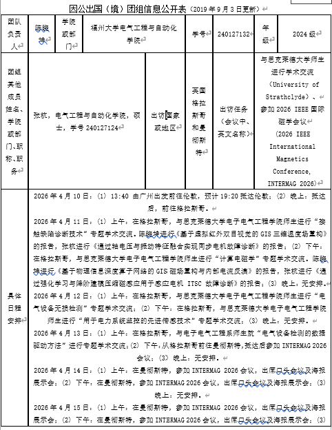 2024级电气工程专业研究生,学号240127124。学院拟派陈晓坤硕士生、张杭硕士生于2026年4月赴英国格拉斯哥思克莱德大学(University of Strathclyde)进行学术交流,赴曼彻斯特参加2026 IEEE国际磁学会议 (2026 IEEE International Magnetics Conference, INTERMAG 2026),现予以公示。公示时间从2026年3月17日起算,公示期为五个工作日。如有异议,敬请监督。联系电话:0591-22866584。